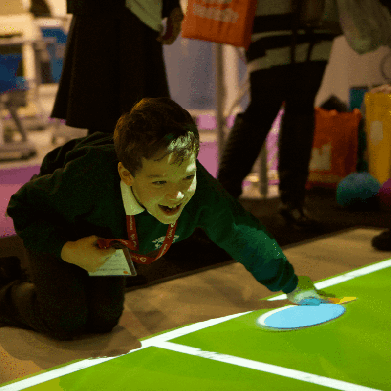 Wizefloor is an award-winning interactive surface, encouraging play, movement, communication and collaboration. Energise and engage the mind and body with a variety of games, challenges, activities, and visual effects projected onto the floor, or a table and made interactive using camera tracking technology. Taking part individually, or in small teams participants can use their hands, feet, and other soft play items, such as bean bags and cones to complete challenges, score points, answer questions, or simply create mesmerising and calming visual effects.
